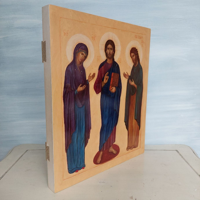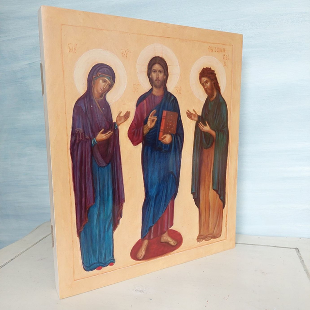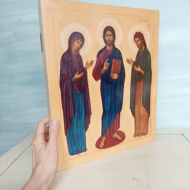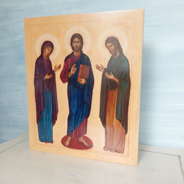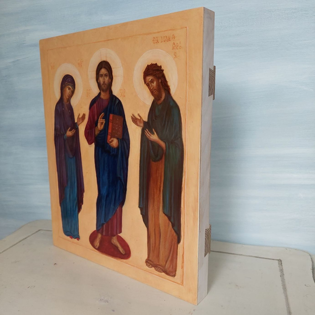 Ikona DEESIS (2023 r.) wzorowana synajską ikoną DEESIS z XII w., ze zbiorów Klasztoru św. Katarzyny. Deesis – modlitwa, prośba , usilna prośba, motyw temat kompozycyjny w ikonografii chrześcijańskiej. Maryja i Jan Chrzciciel, zwróceni do Jezusa w geście wstawienniczym za nami. Ikona wykonana w całości ręcznie, z użyciem tempery jajecznej na desce lipowej ze szpongami dębowymi, na jaskółczy ogon. Deska z płótnem, gruntowana 12 warstwami zaprawy klejowo kredowej przy użyciu tylko naturalnych składników.