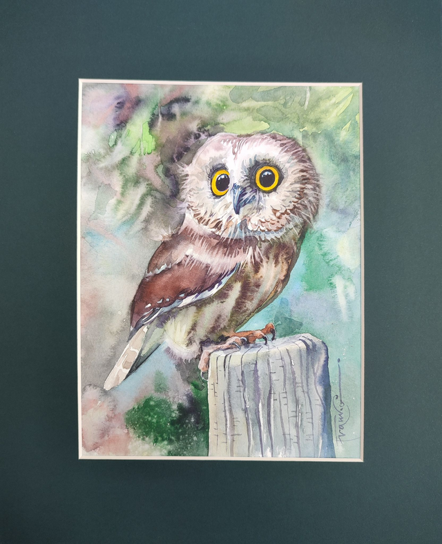 Sówka, 35x28 (24x18 w świetle passe-partout) akwarela 2025