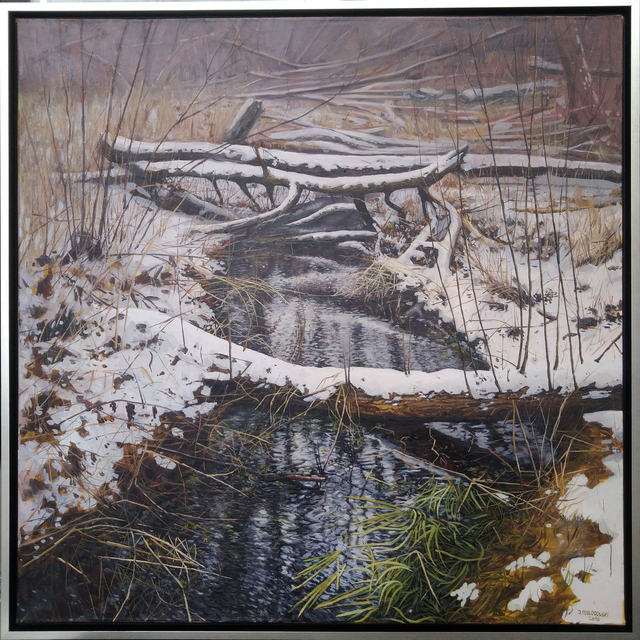 Zimowy potok w Kijanach, 100x100 olej płótno 2018 oprawiony