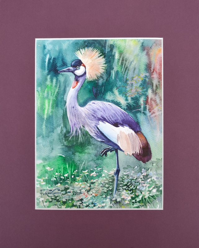 Żuraw królewski , 35x28 (24x18 w świetle passe-partout) akwarela 2024